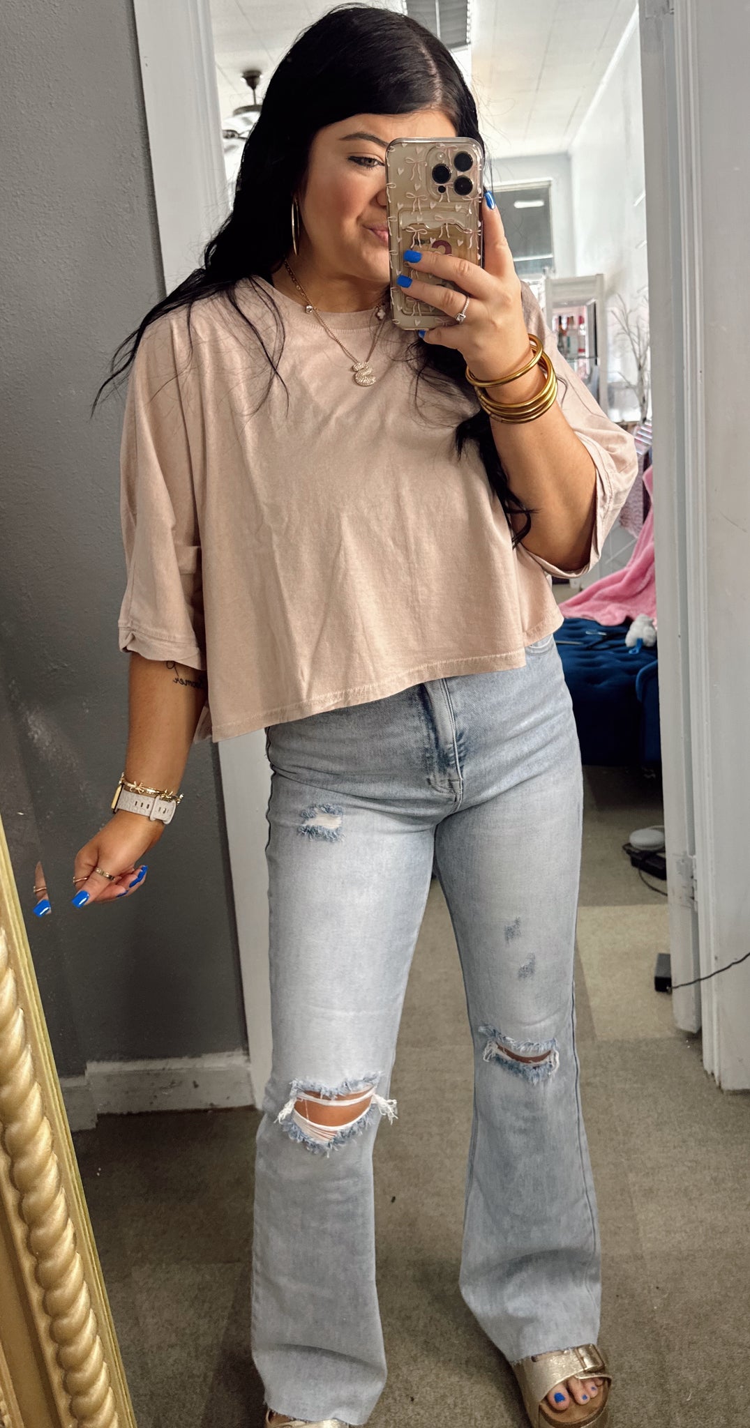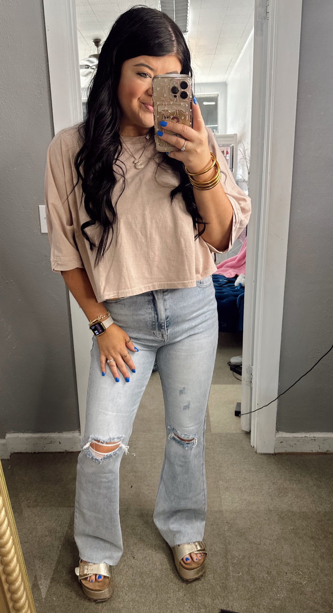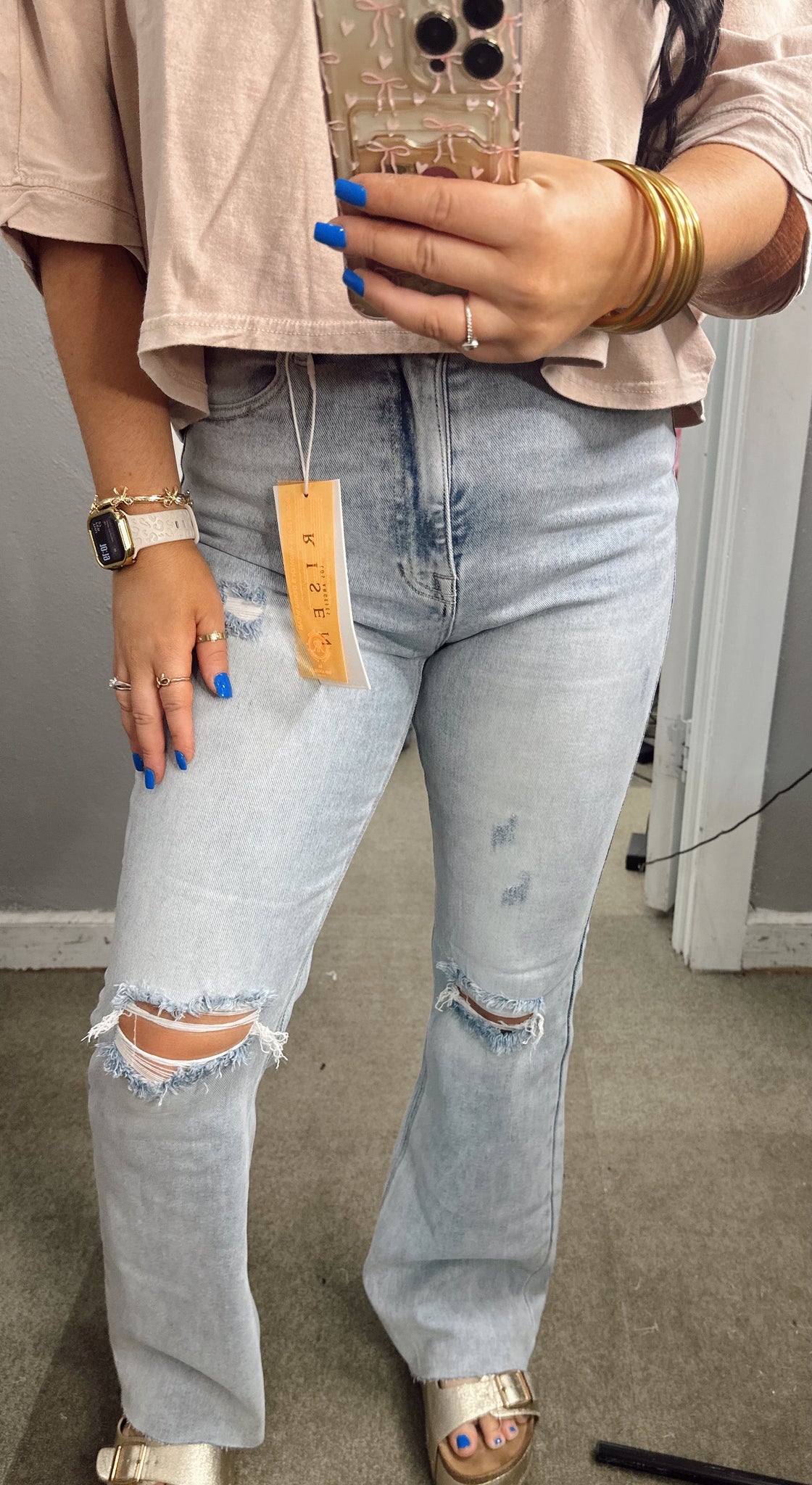 These are high rise flared jeans! Savannah is wearing her true size which is a 11! Very stretchy and comfortable!