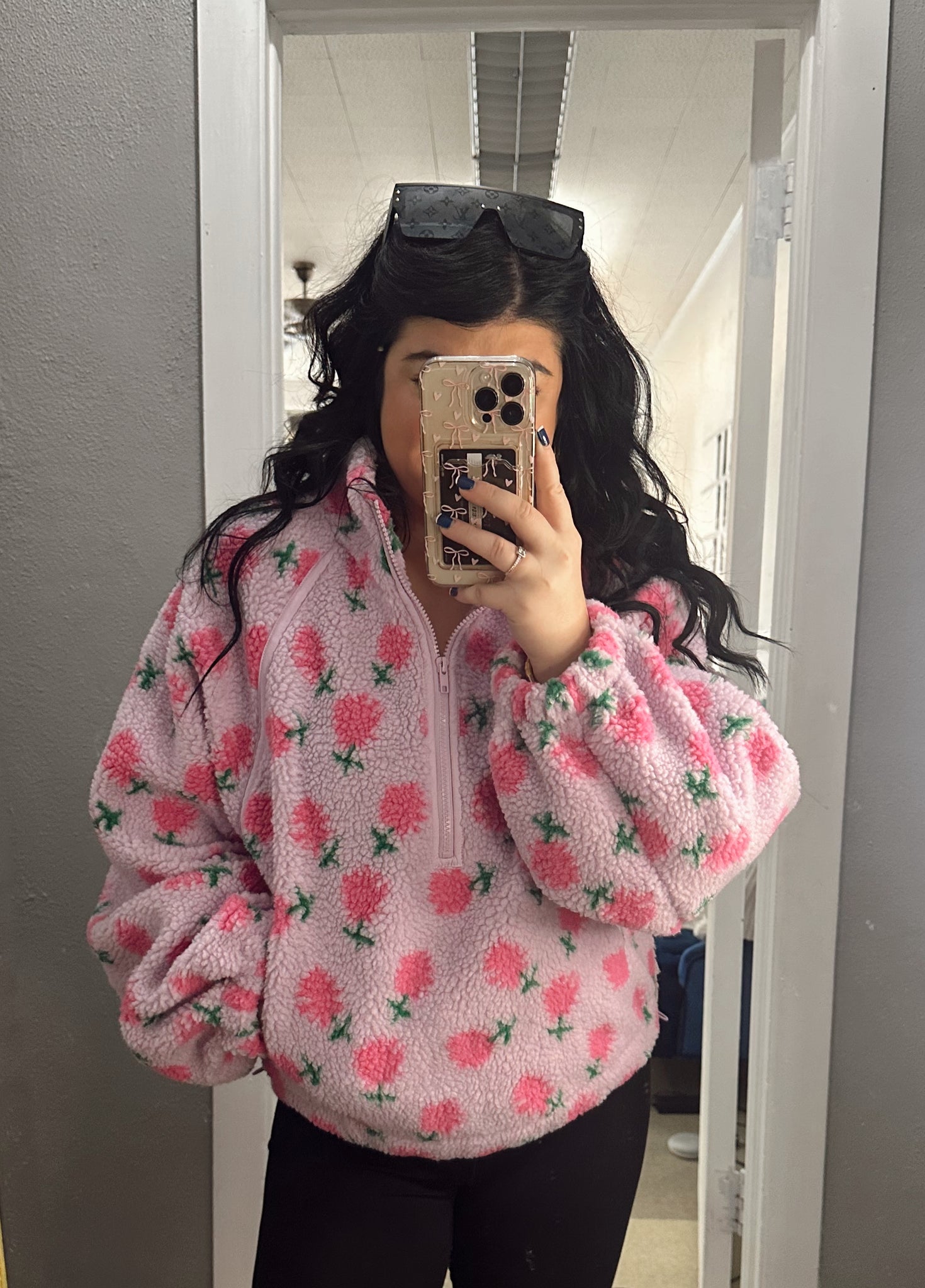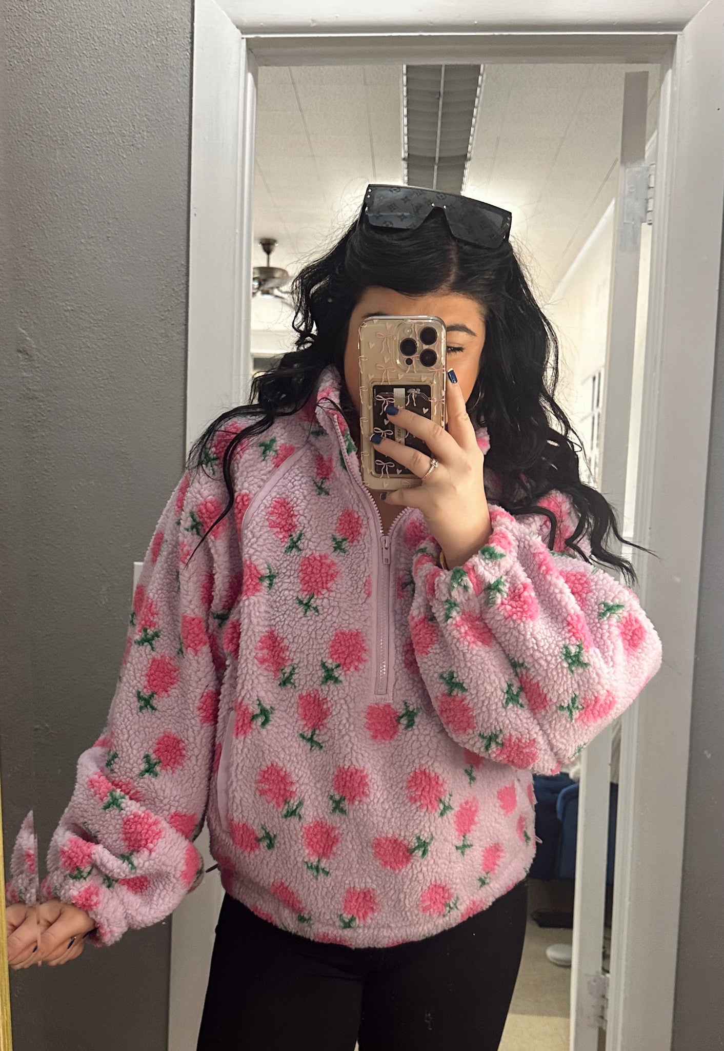 This jacket is so cute and fun! Does have drawstring to adjust the bottom! Semi crop falls at the waiste line! Savannah is wear her true size which is a large! Fits true to size