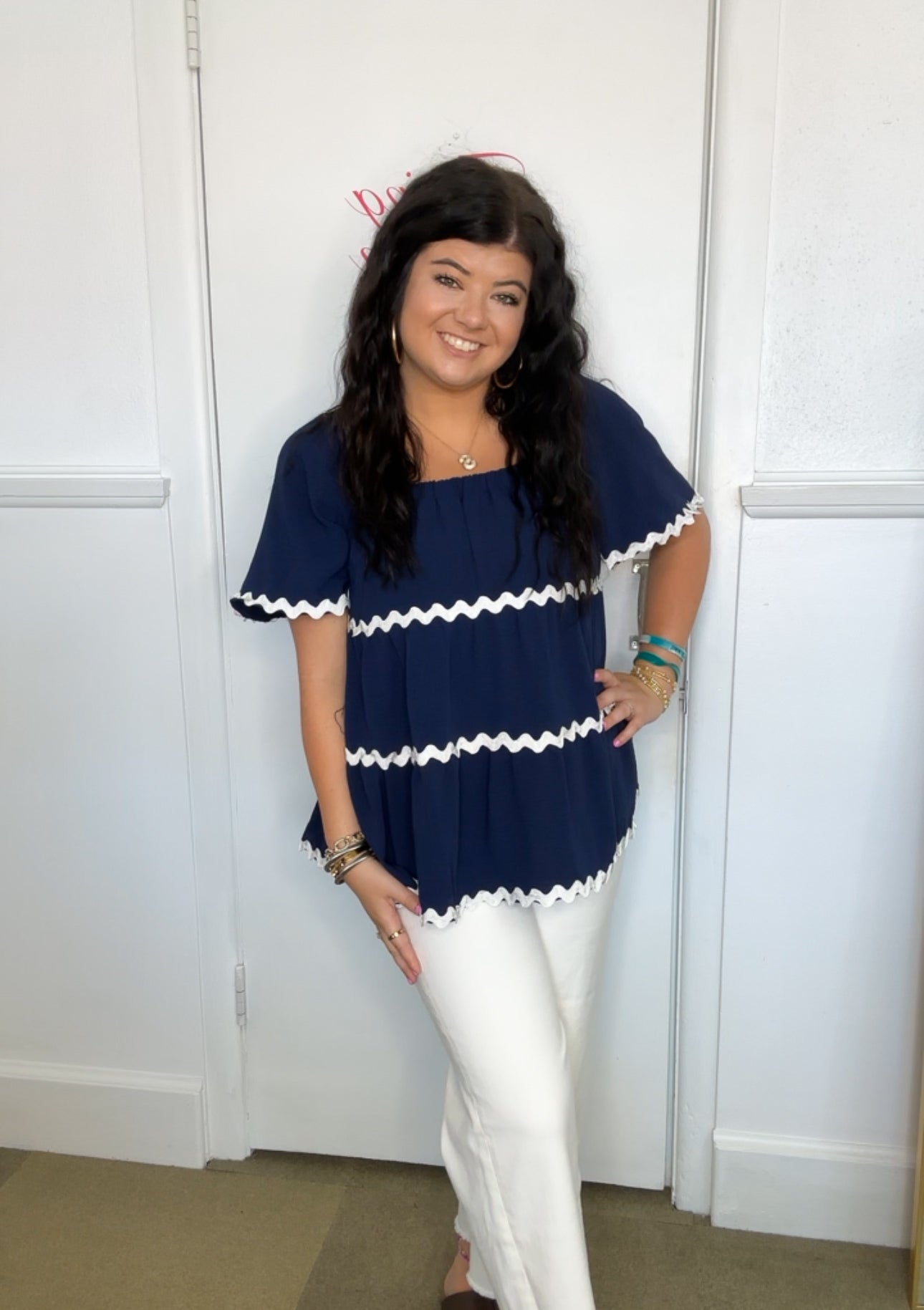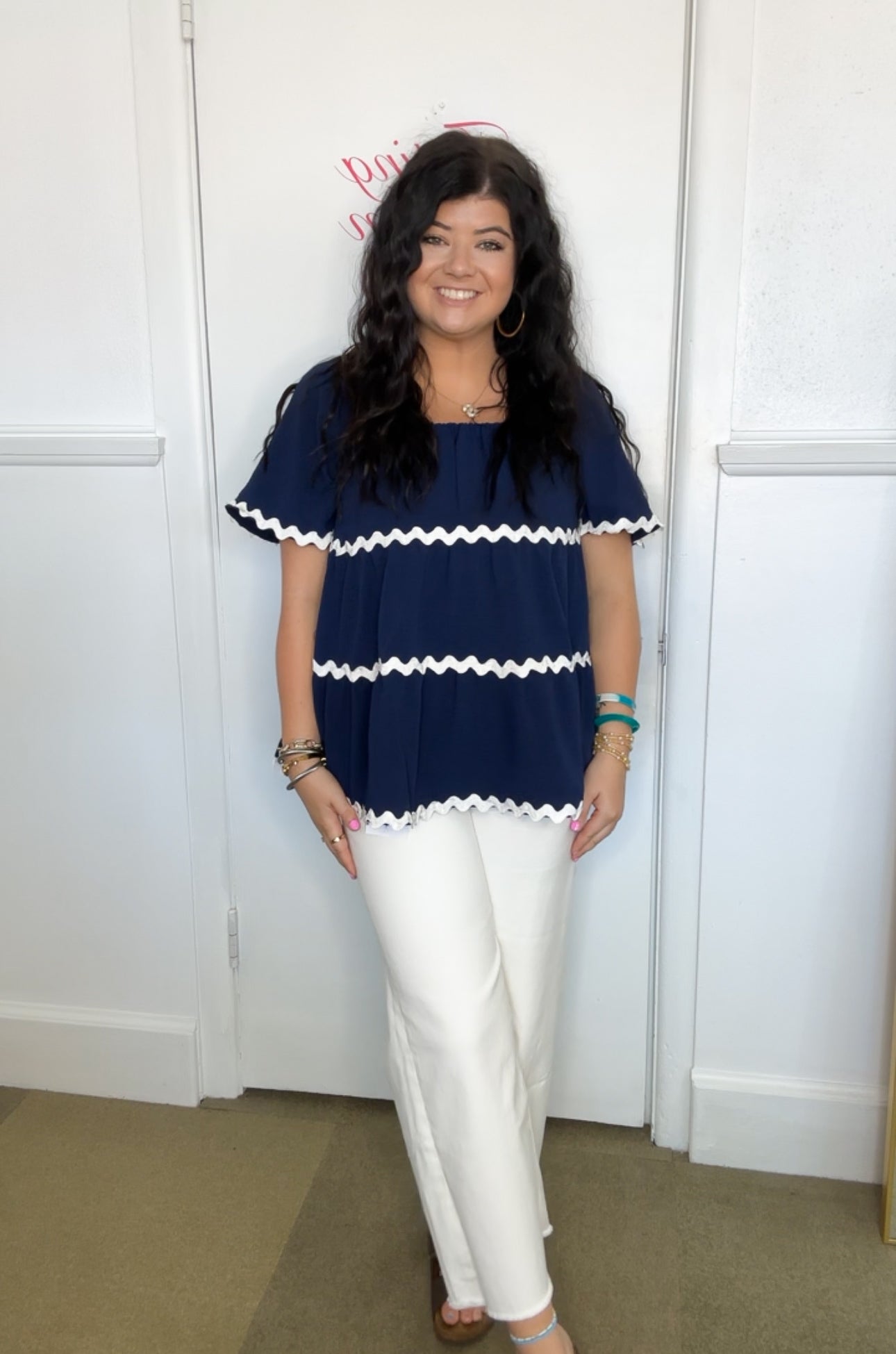 The ric- rac trend has now hit lake martin boutique!! This style is so cute and fun!!! Very flowy and comfortable! But also so stylish and cute! Savannah is wearing the large