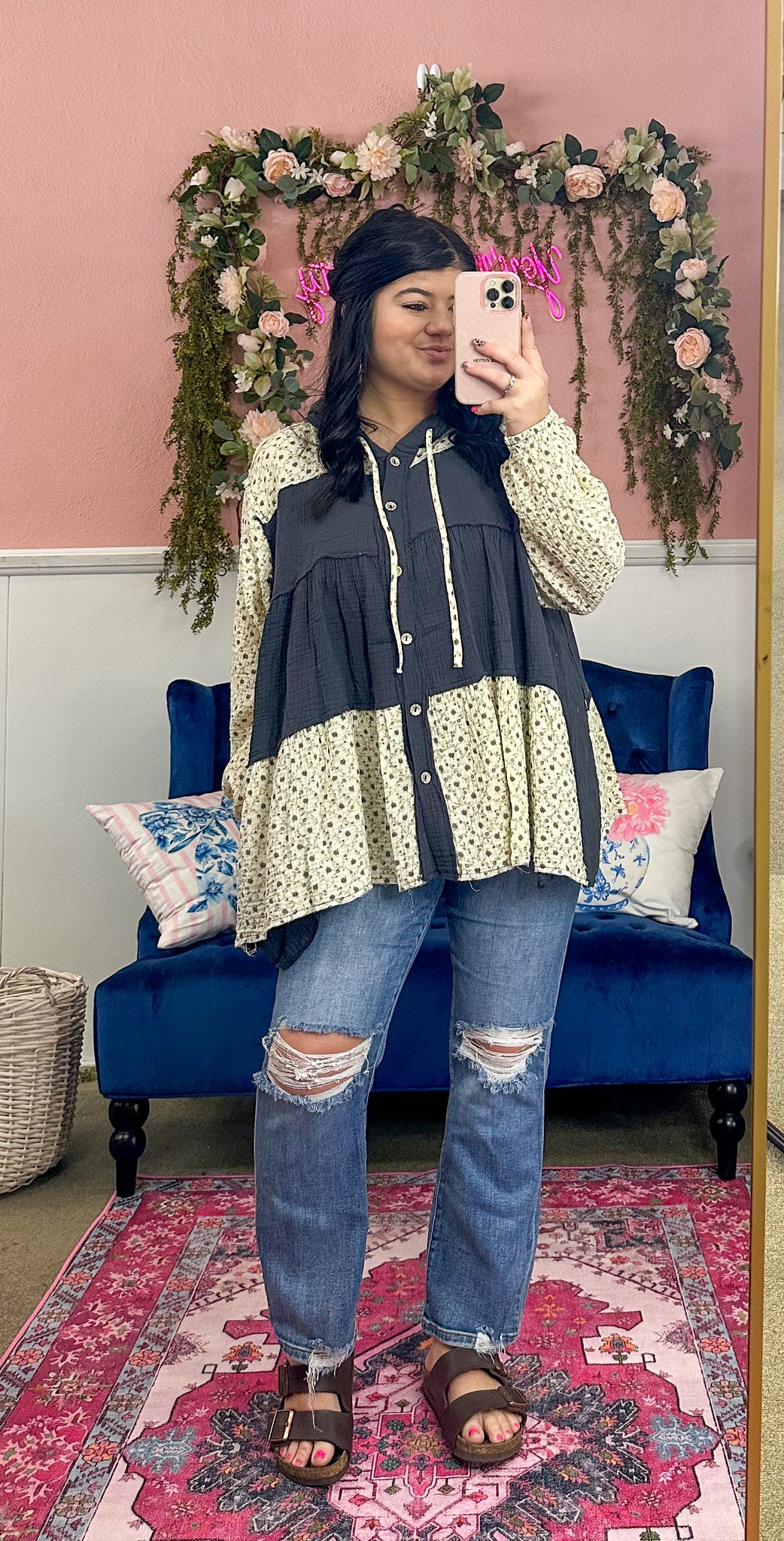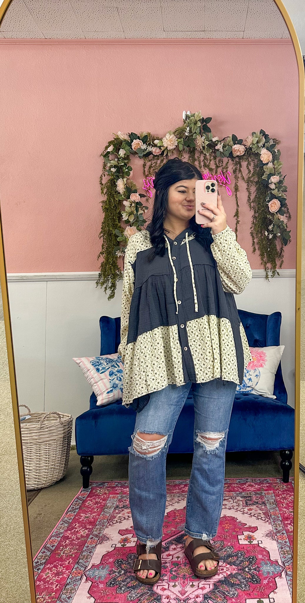 This POL top is so unique and fun! Fits oversized and is longer in the front than the back! Could easily be worn unbuttoned also!