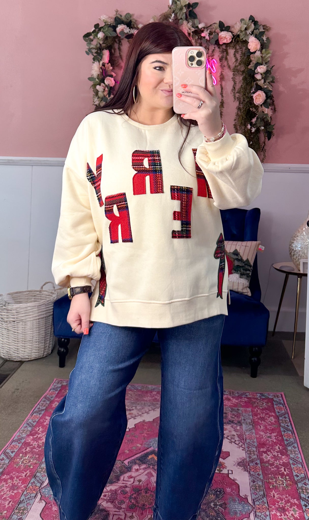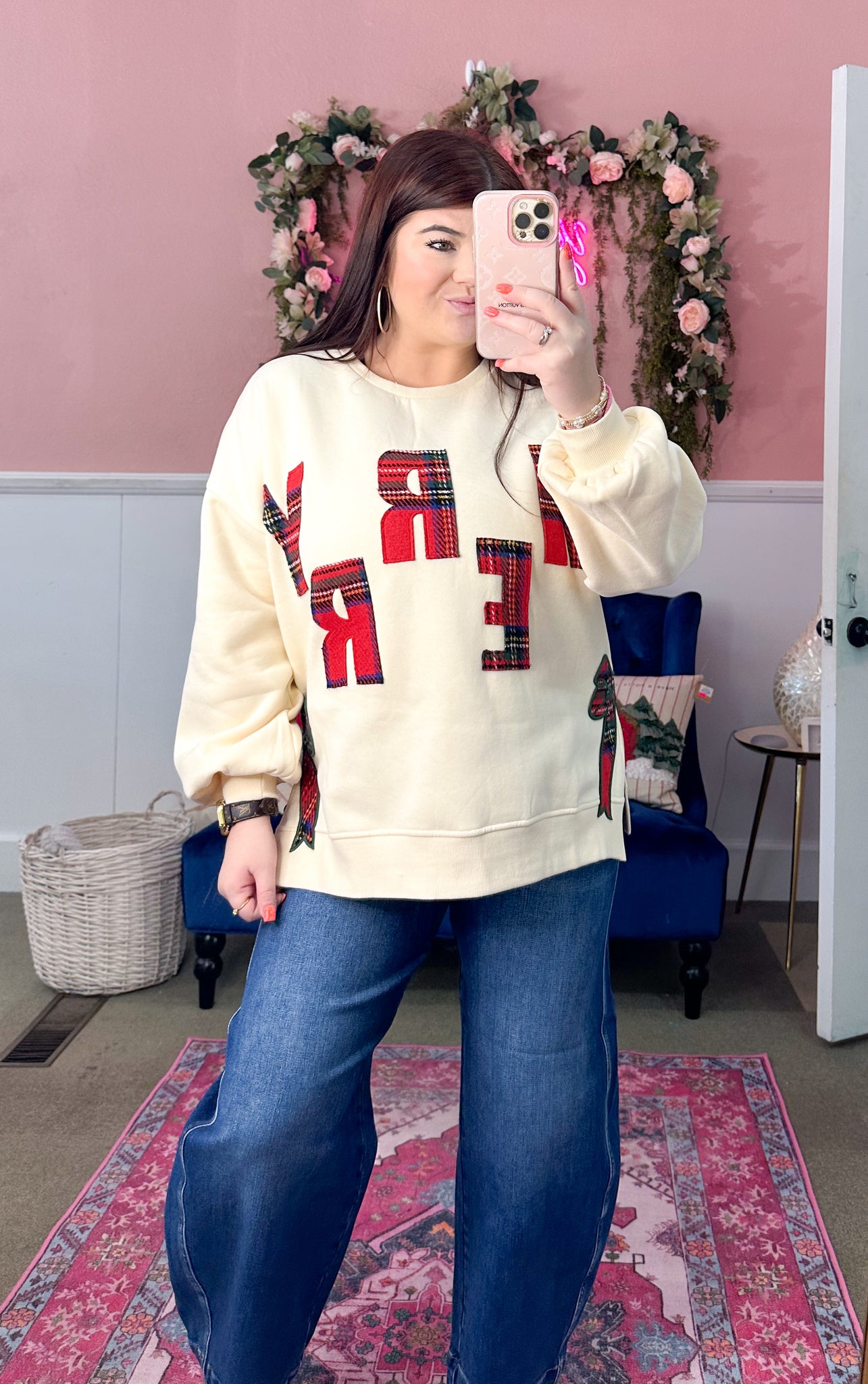 This patch work top is so cute and fun! Fits true to size savannah is wearing the large! Has an embroidered bow on each side!